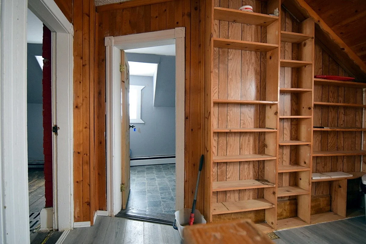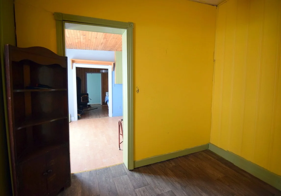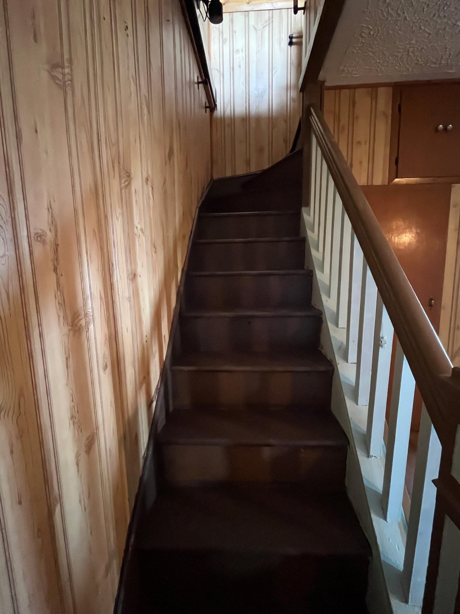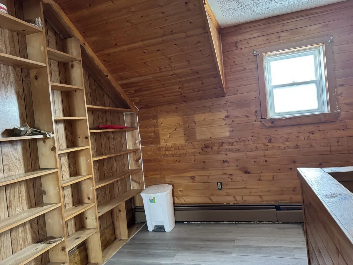 A couple of small rooms house the furnace, laundry, and some storage. A den or ‘pass-through’ room has a bedroom off it, and leads to the living room with wood burning stove. From here you can access three other bedrooms on the main floor. Stairs from the living room take you to the two upstairs bedrooms and second bath, via an 11’ x 8’ wood-lined landing.