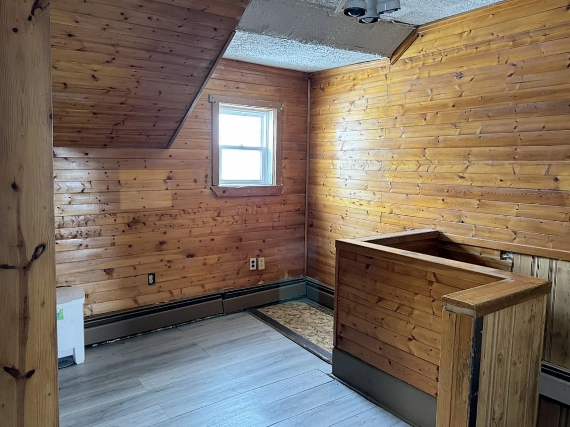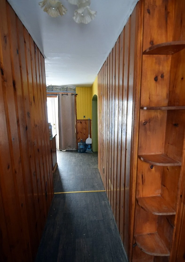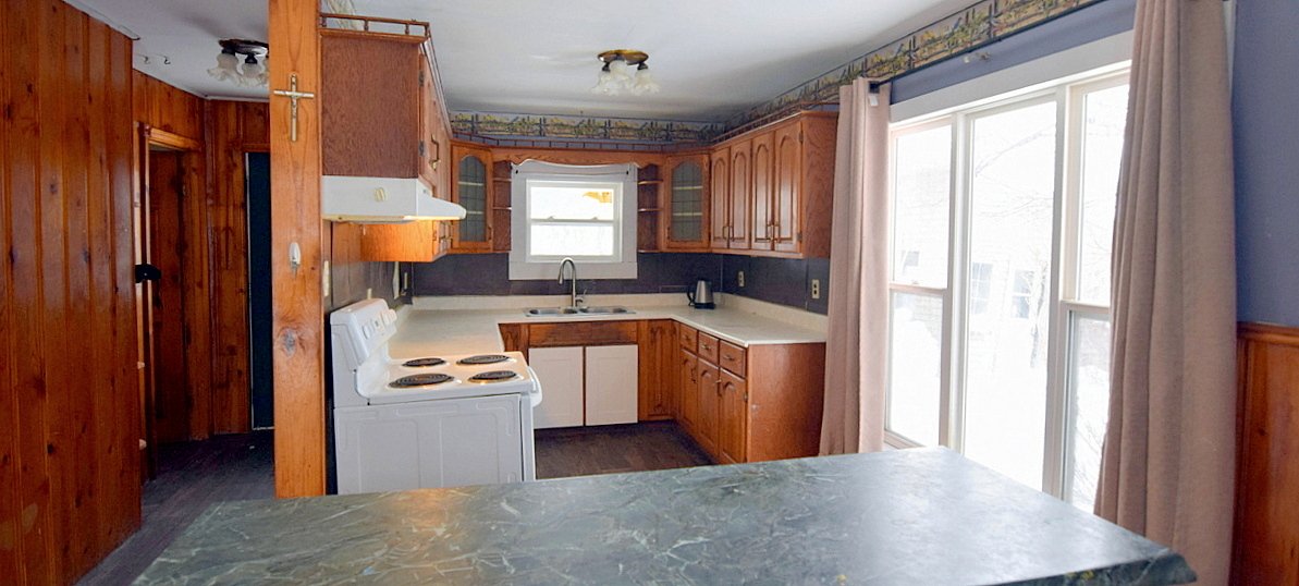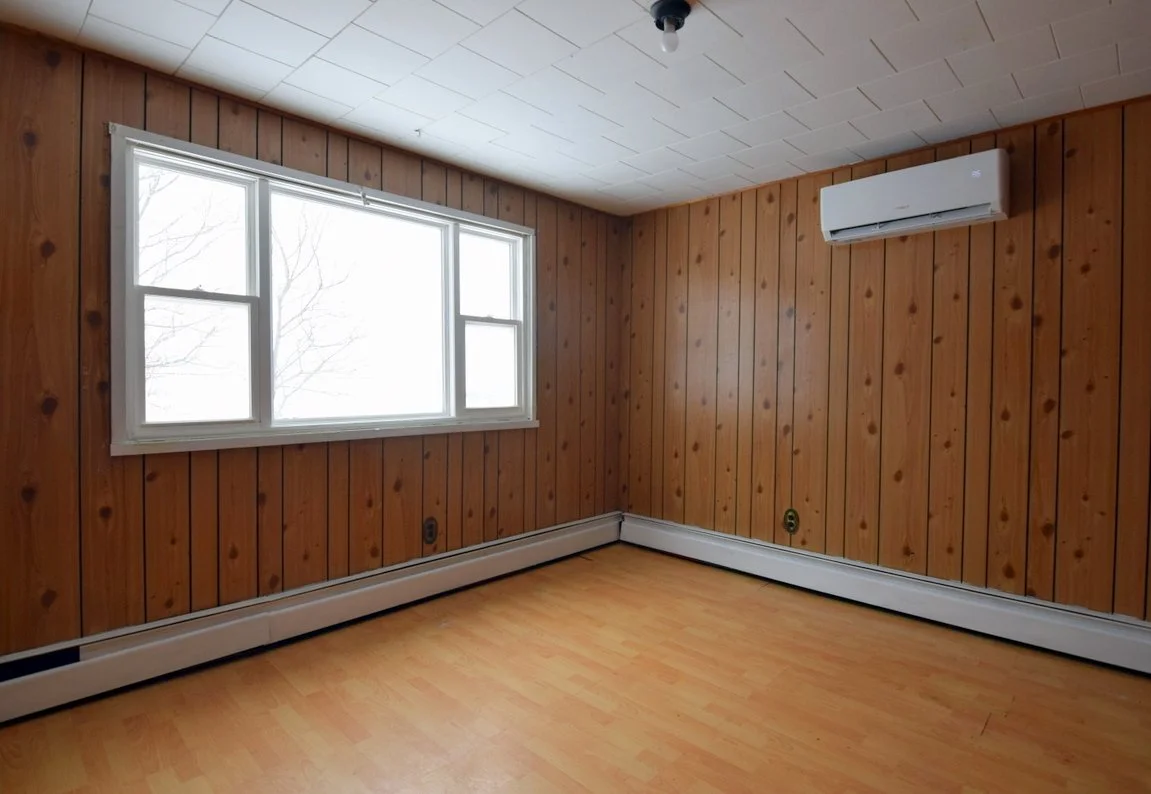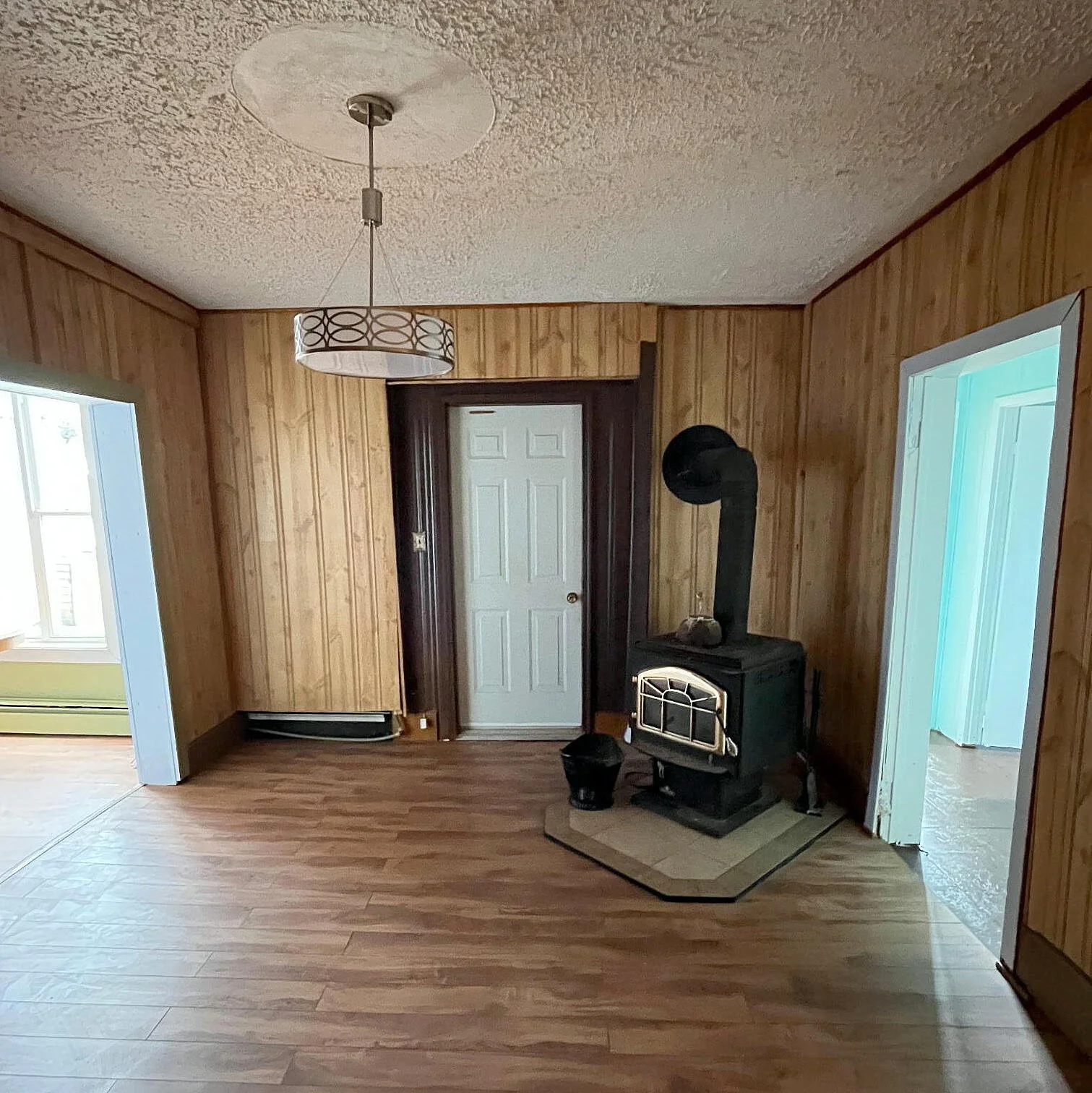 A couple of small rooms house the furnace, laundry, and some storage. A den or ‘pass-through’ room has a bedroom off it, and leads to the living room with wood burning stove. From here you can access three other bedrooms on the main floor. Stairs from the living room take you to the two upstairs bedrooms and second bath, via an 11’ x 8’ wood-lined landing.
