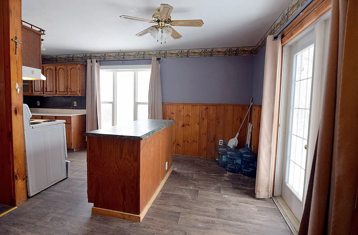 Entering the house, a corridor - with bathroom off it - leads to the large kitchen, brightly lit with windows and patio doors to the deck, and an island.