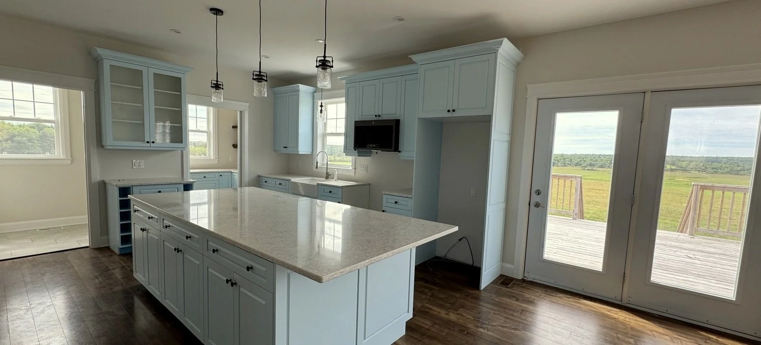 The kitchen has sky-blue cabinetry, stone countertops in whitish-grey tones, an island, a separate pantry with pocket door, and south-facing windows that offer abundant natural light.