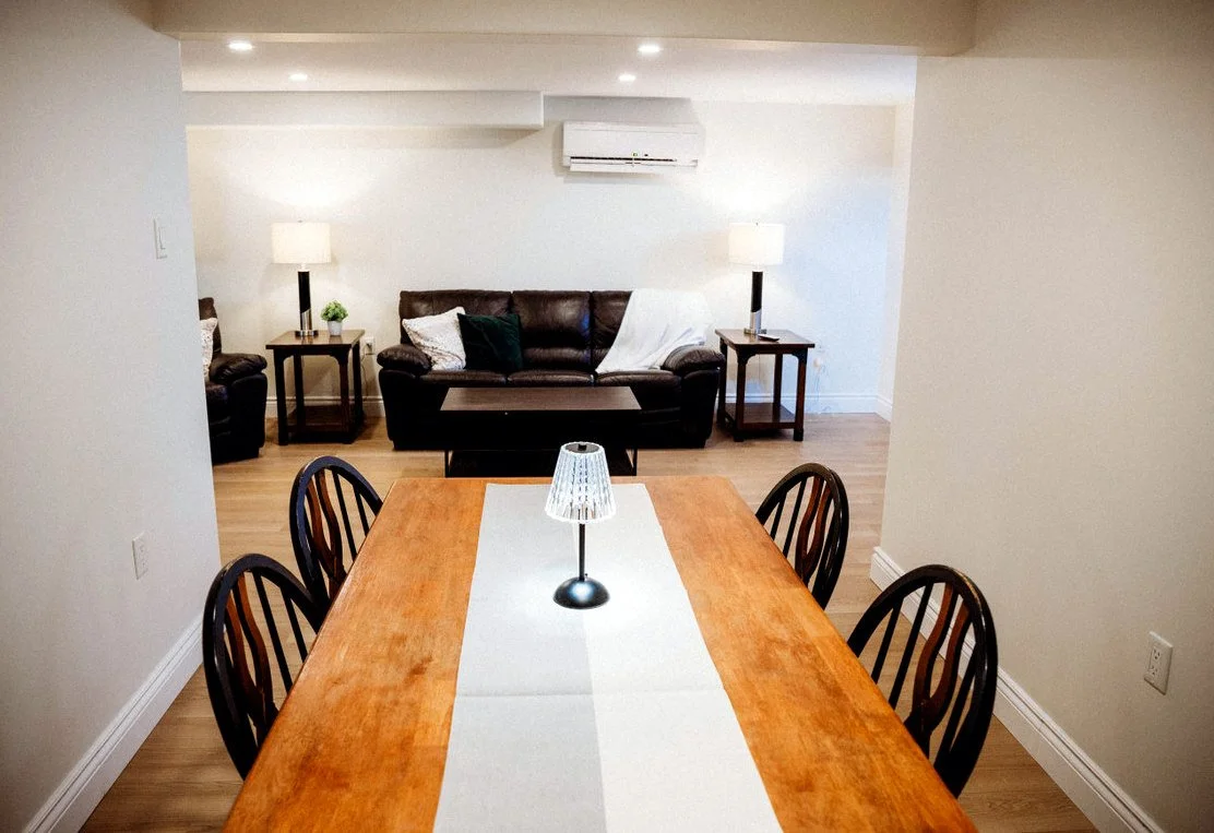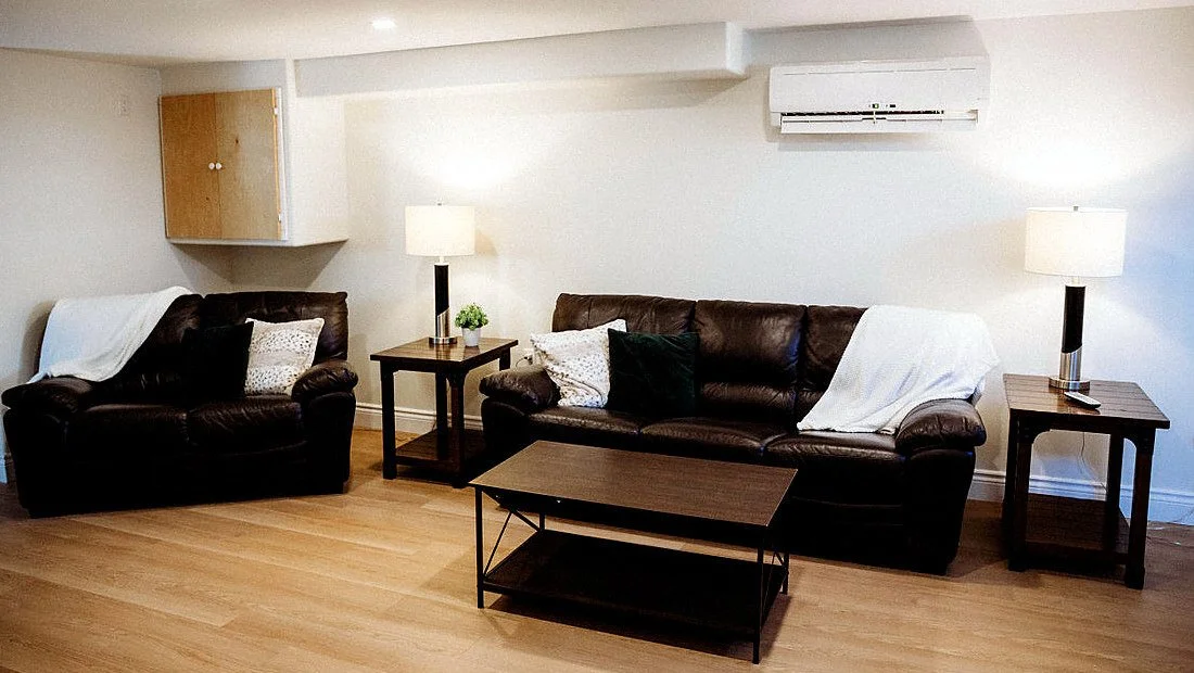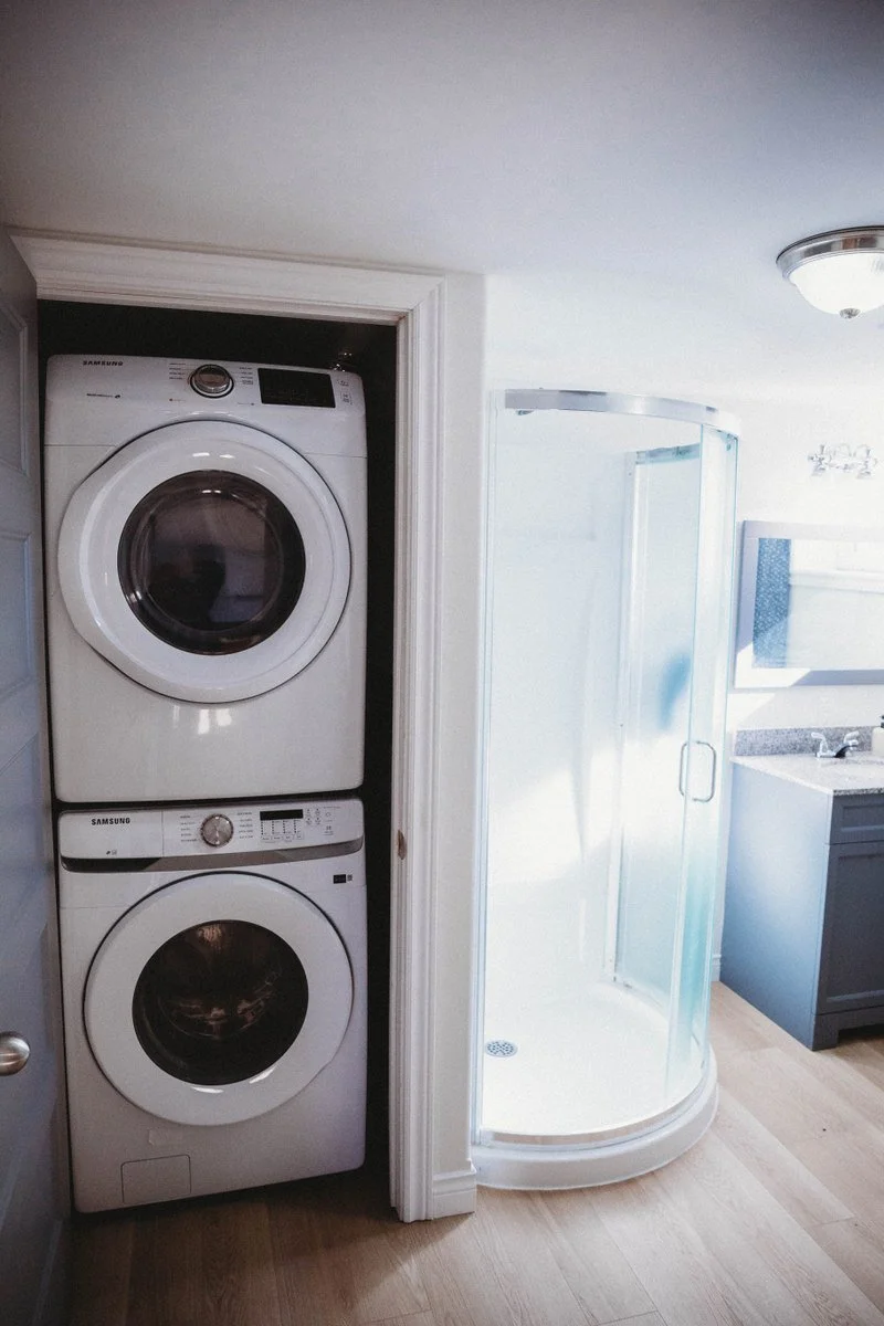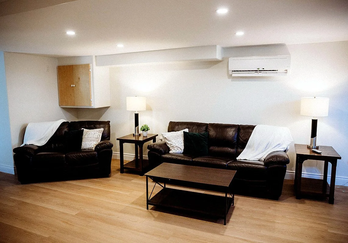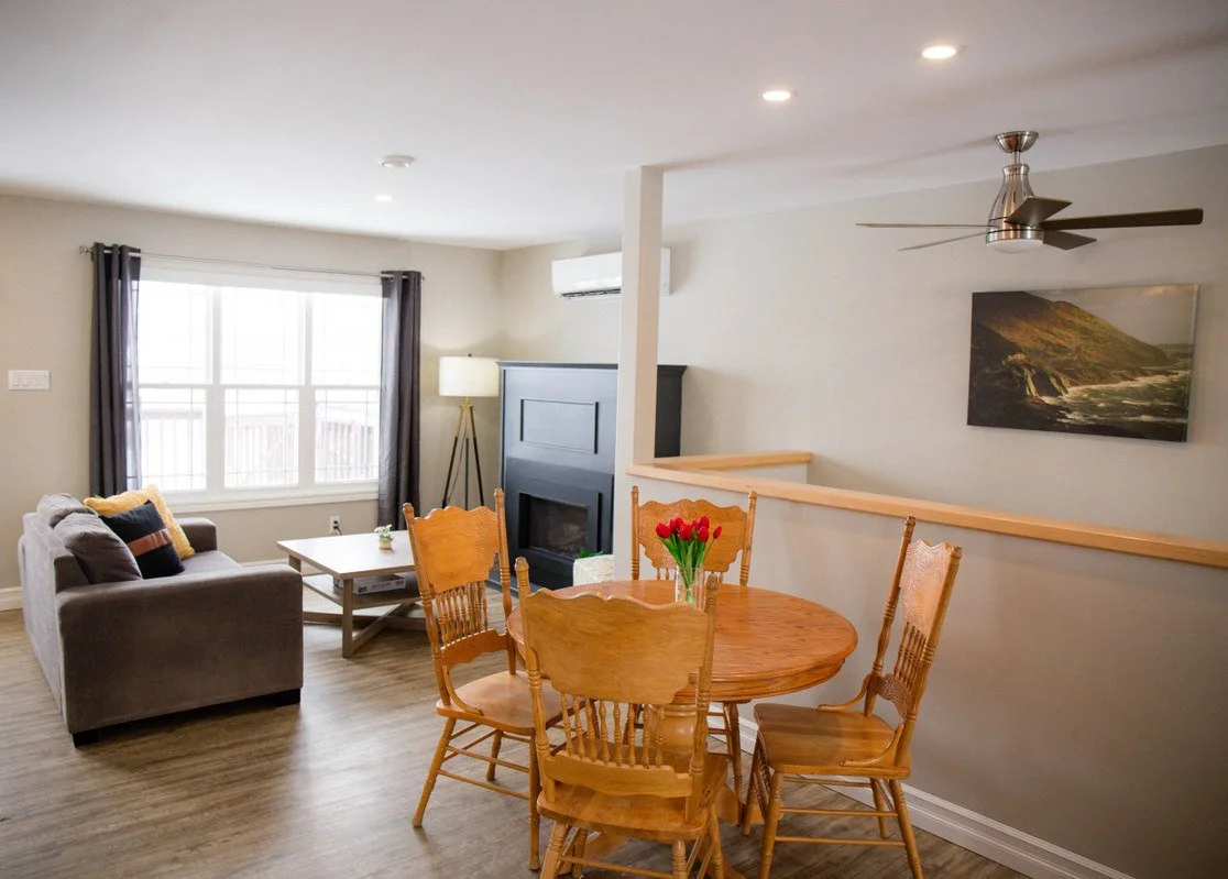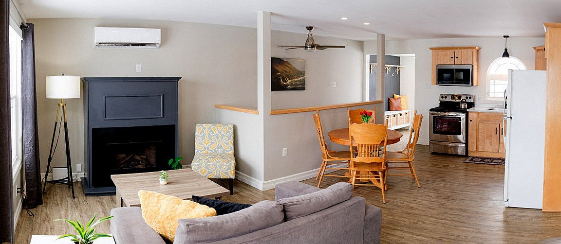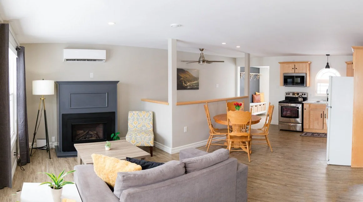 The main floor is an open plan kitchen/living area with a lovely propane fireplace. Also there is a heat pump, Two spacious bedrooms and a bathroom complete this floor.