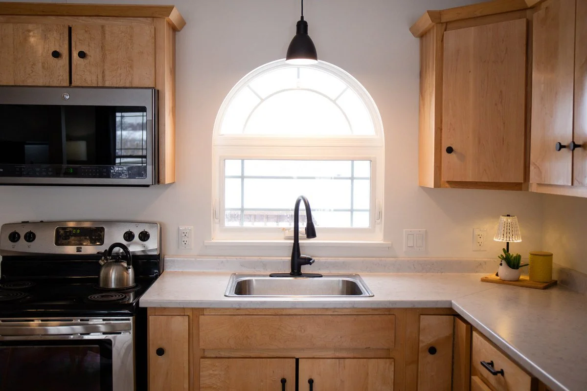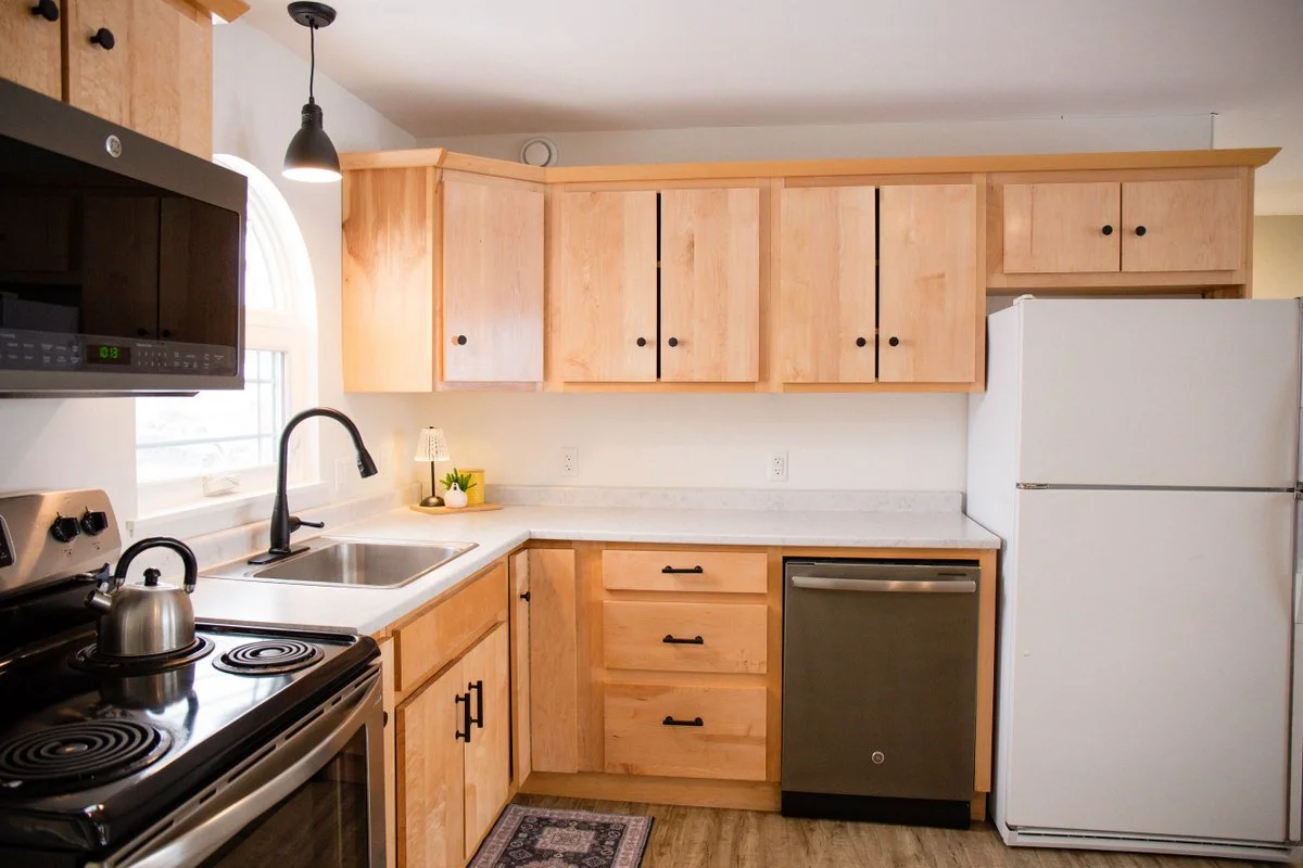 The kitchen has maple cabinetry, just refinished, and a new counter-top, and the house is freshly painted.
