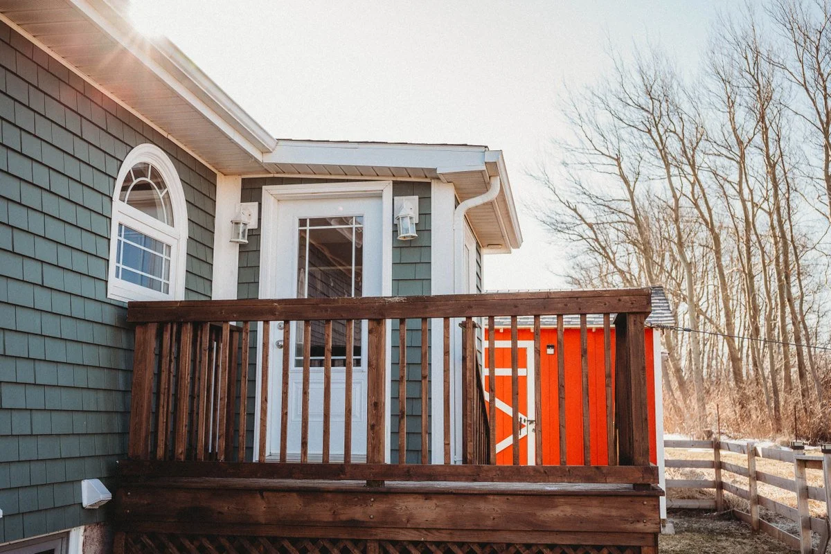 Decks both front and rear, with exterior doors to each.